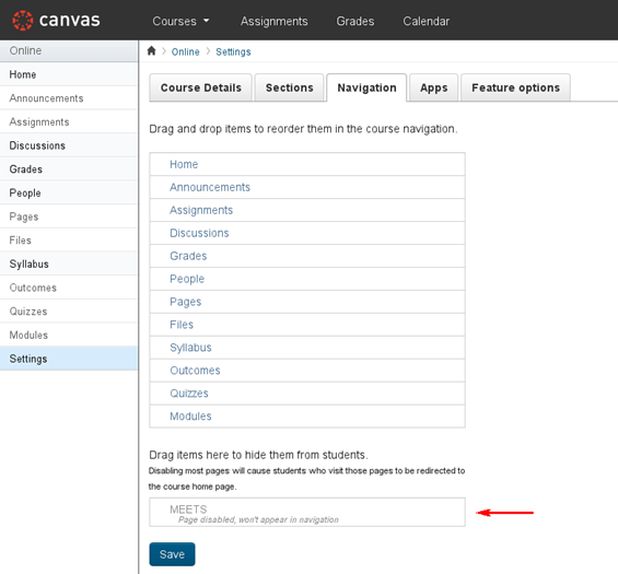 Drag the MEETS box into the list of active navigation links and place it in the position in the list where you wish to have it appear. (This list matches the links on the left panel, and will let you rearrange any of the links which appear there as well)